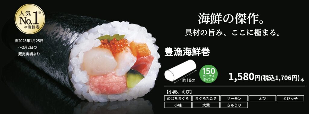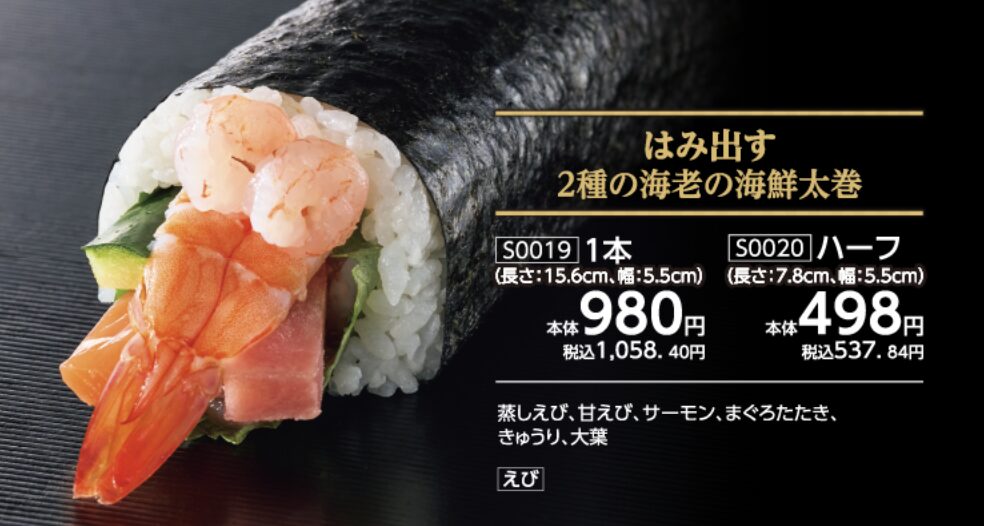 恵方巻では海鮮を増やすほど“見た目の華”として卵を入れがちですが、サミットは海鮮に振り切って卵なしを実現している点がうれしいポイント。