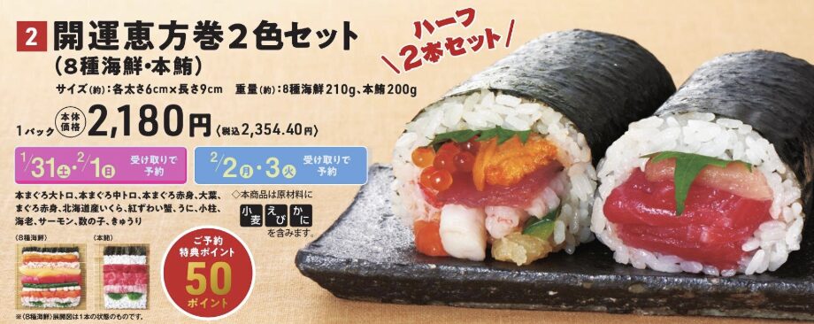サミットは近隣商圏に強い地域密着型で、恵方巻は海鮮特化の卵なし2品が選べるのがポイント。