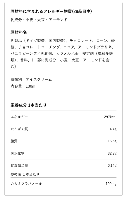 カカオフラバノールは、血流や血圧などの研究が進められている成分としても知られており、健康意識が高い人や冬のご褒美アイスを求める層に向いた一本と言えます。