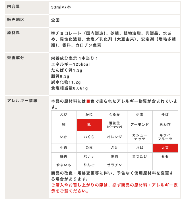 チョコレートアイスバー | 乳・大豆 | 比較的シンプルで卵・小麦は不使用 |