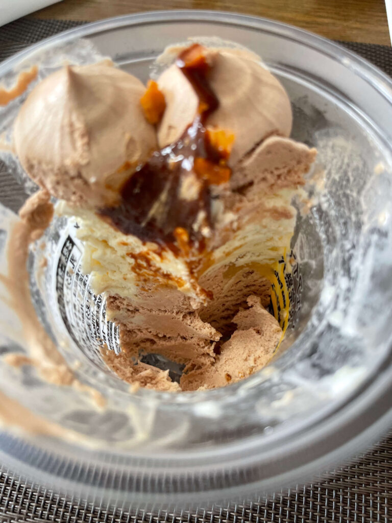 スプーンを入れると、アイスは層になっていて(3層っぽい)、そこに濃厚な甘熟バナナソースがとろ〜り絡む設計。私は一層ずつ丁寧に…より、全層まとめて一気食い派。