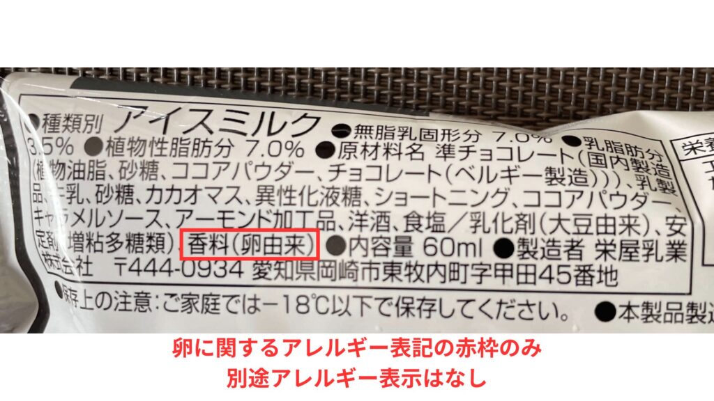 購入時は「卵なし」と思い込んでしまい、後から確認すると香料に卵が含まれていた。