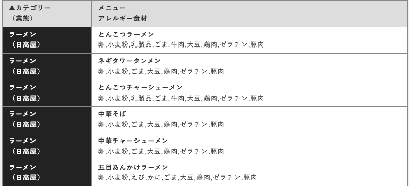 一般的な「●・▲・−」などの一覧表ではなく、各メニューに含まれるアレルゲンが個別に記載される形式のため、表に慣れている人ほど確認に時間がかかります。