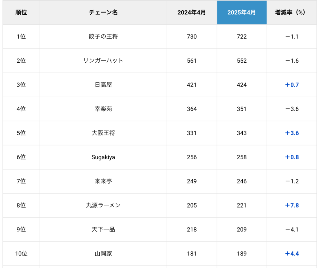 1位の餃子の王将は全国に700店舗を超える店舗を保有しております。